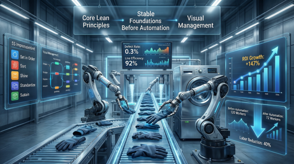 Lean manufacturing in the glove industry creates a stable base for automation and digital systems. Automation fails when processes remain unstable or poorly defined. Lean manufacturing standardizes workflows before introducing sensors, robotics and data platforms. This sequence improves automation return on investment and reduces implementation risk.